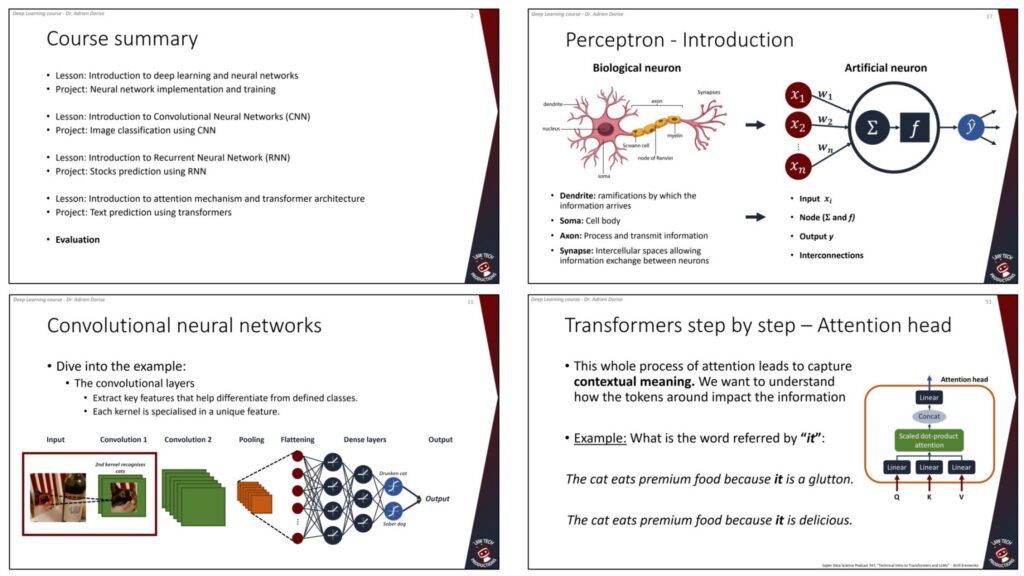 • Curriculum covers neural networks, convolutional networks, recurrent networks, and transformers.
